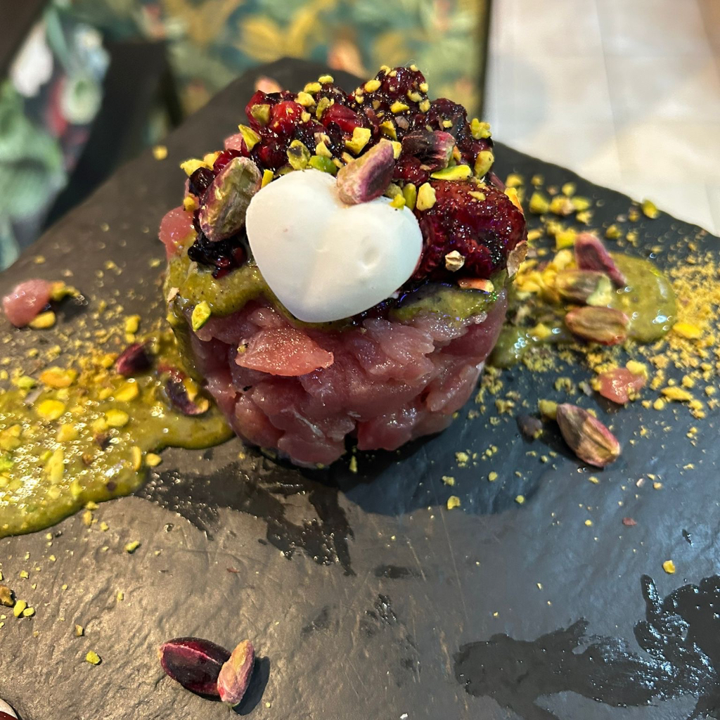 Tartare di Tonno Rosso** ,marmellata di frutti di bosco on made,gelato al cocco pesto di pistaccho e crumble di pistacchio, (Allergeni: 4,5,7,8)