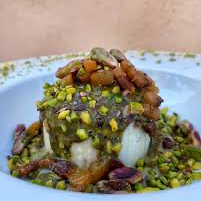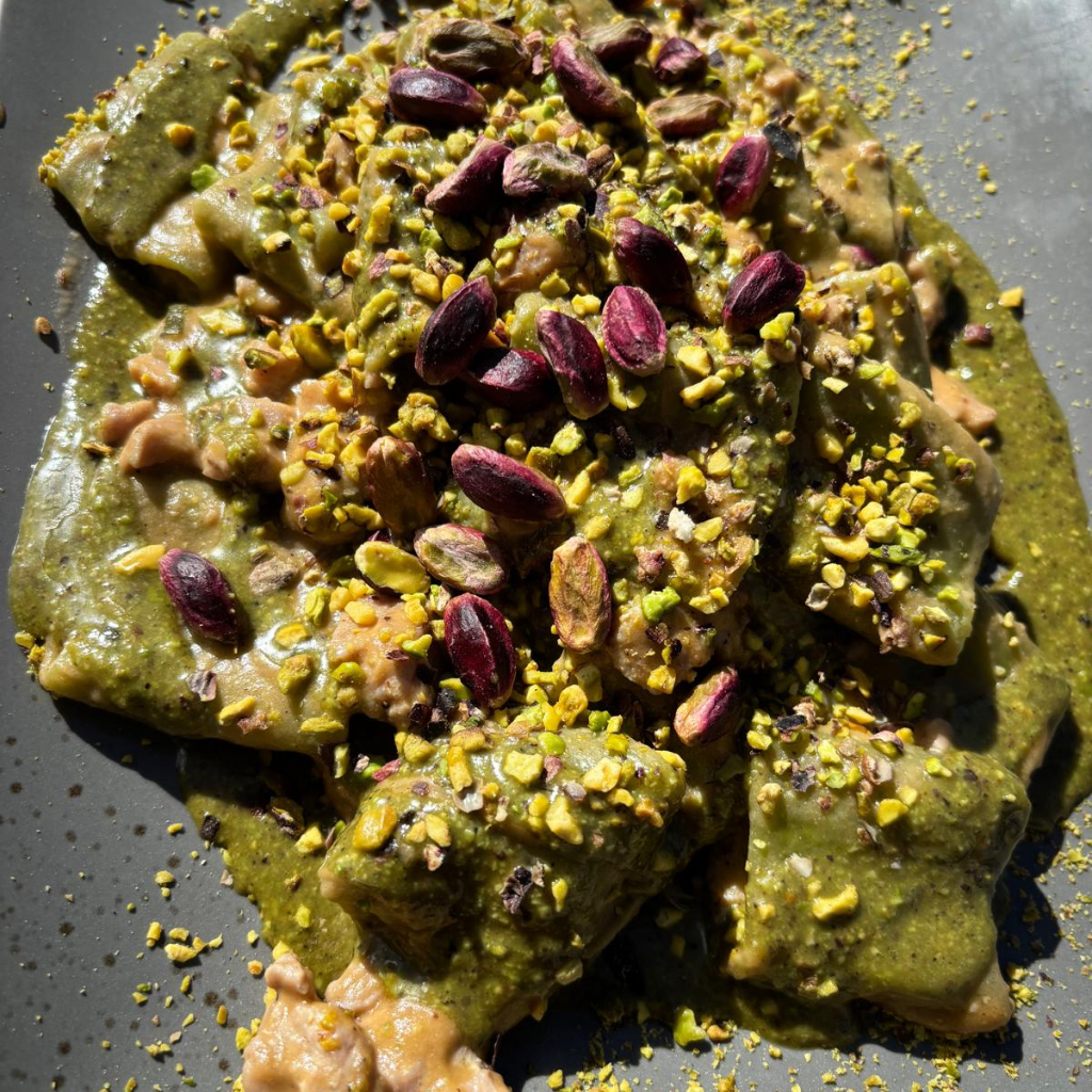 Fresca burratina di Andria affumicata, con pistacchio in tripla consistenza e guanciale croccante (Allergeni: 5,7,8)