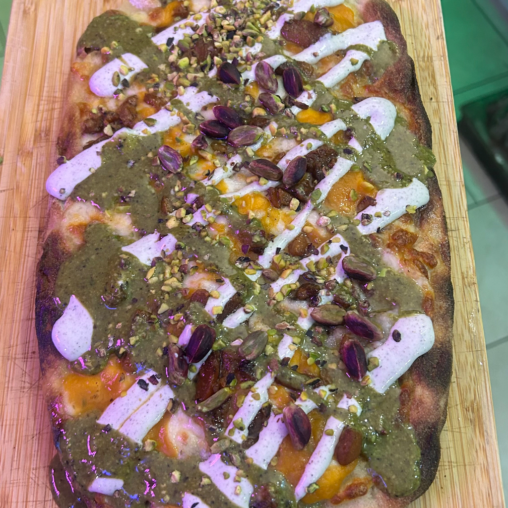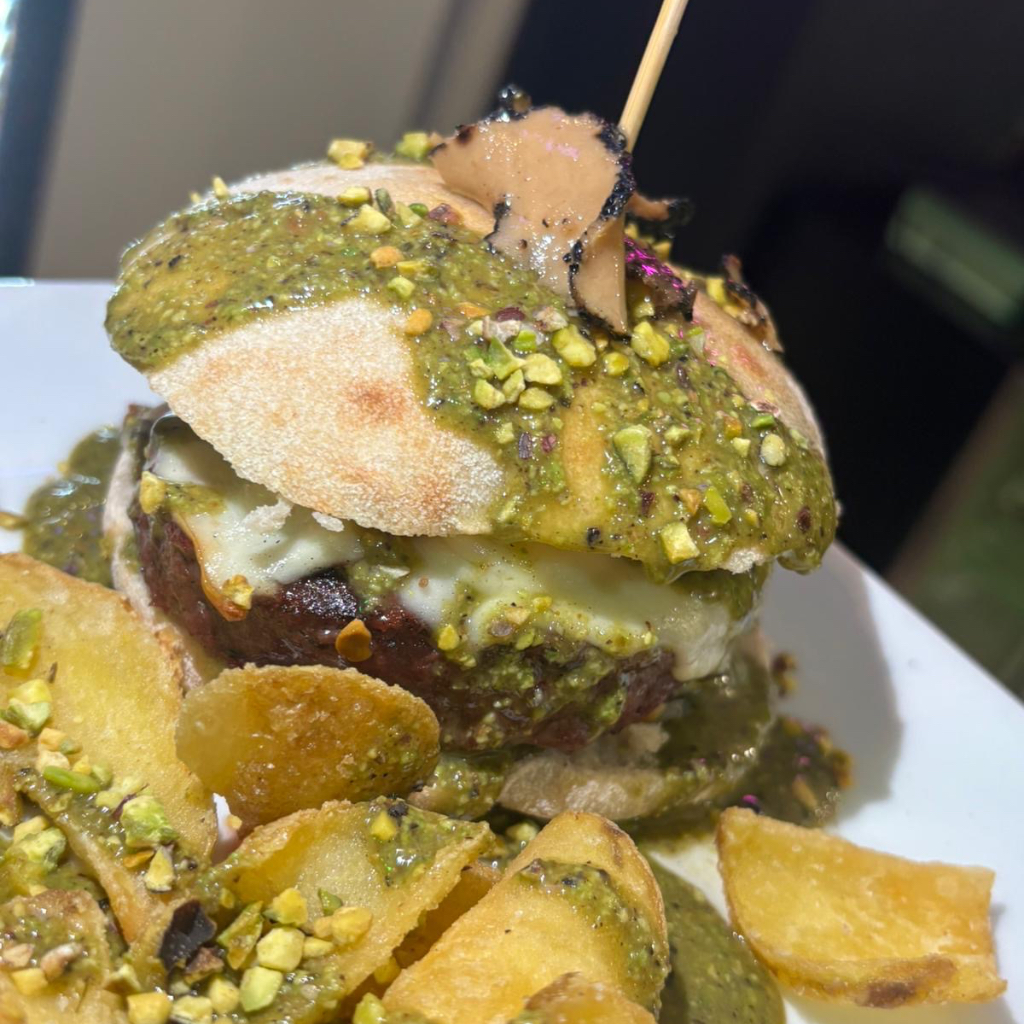 Croccantissimo Bun artigianale con impasto della Pinsa Romana, hamburger di manzo da 180 g cotto alla brace, Provola affumicata croccante, crema di zucchine, fonduta di provola , pistacchio in tripla consistenza, servito con patatine pistacchiose (Allergeni: 1, 5, 7, 8)
