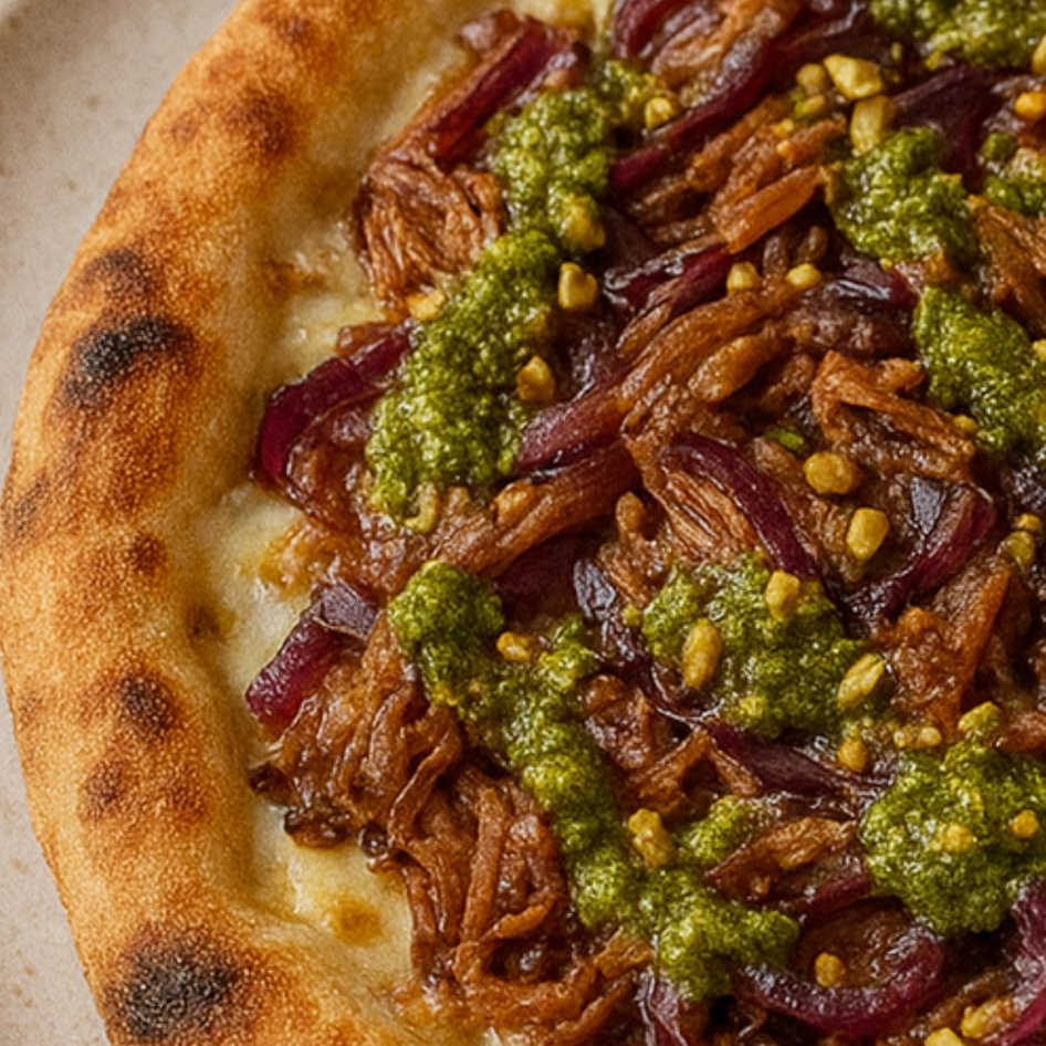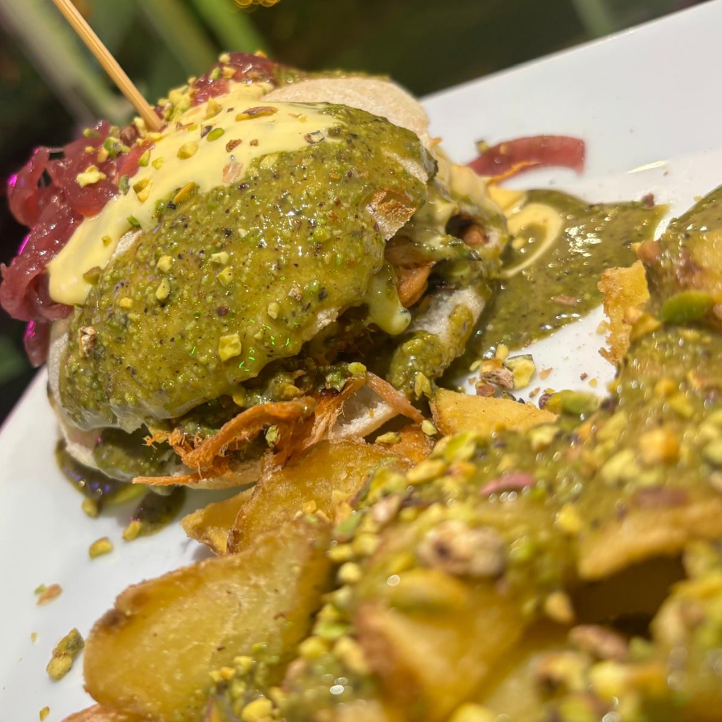 Croccantissimo Bun artigianale con impasto della Pinsa Romana , 180 gr di Manzo, Stracciatella, Pesto di Pistacchio, Anelli di Cipolla croccanti accompagnato da Patatine al Pistacchio (Allergeni: 1, 5, 7, 8)