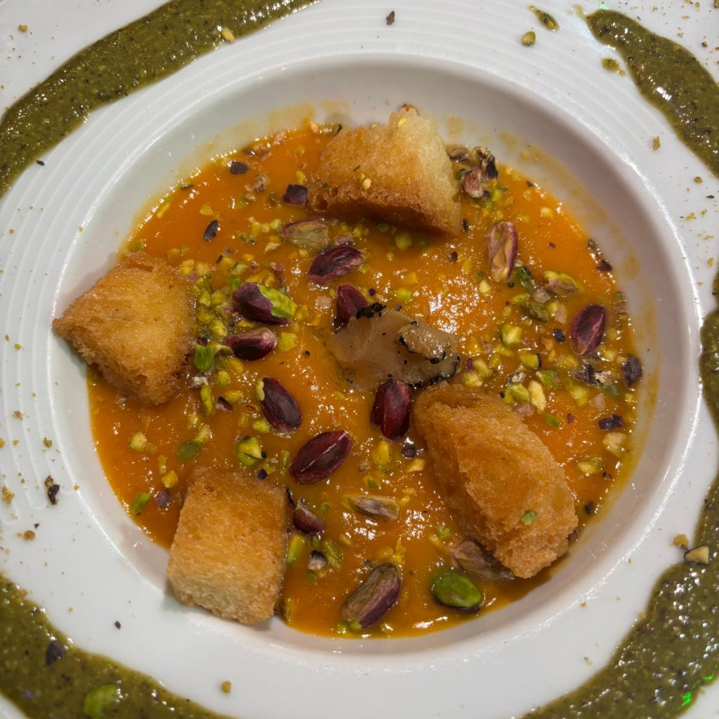 Vellutata di zucca con tartufo, crumble di pistacchio e crostini di pane (Allergeni;1, 5, 8)