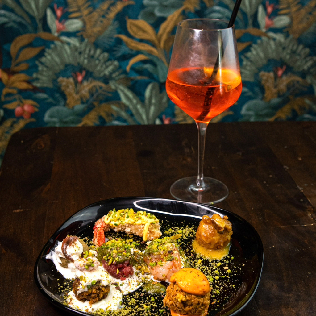 Polpette di manzo completamente panate al pistacchio con burrata e crema di mortadella, gamberi panko con maionese al mango e granella di Pistacchio, pallotte cacio e ova di cui una con majo agli agrumi e alici marinata e una con majo al tartufo e tartare di fassona, Polpette di pulled pork con Maio alla cipolla Rossa caramellata, paccheri croccanti ripieni di fonduta alla carbonara e guanciale croccante(consigliato per 2 persone) (Allergeni: 1, 2, 3, 5,7,8)