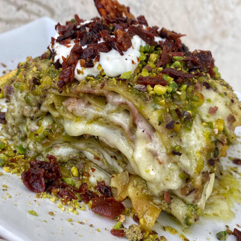 Lasagna fatta in casa con besciamella alla zucca, speck, stracciata al tartufo e Pistaccho (1,3,5,7,8,9)