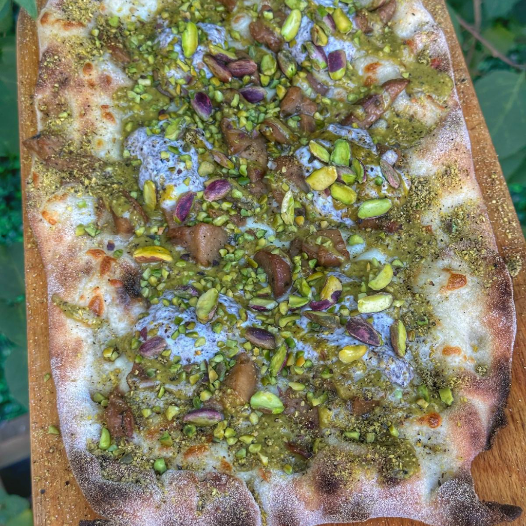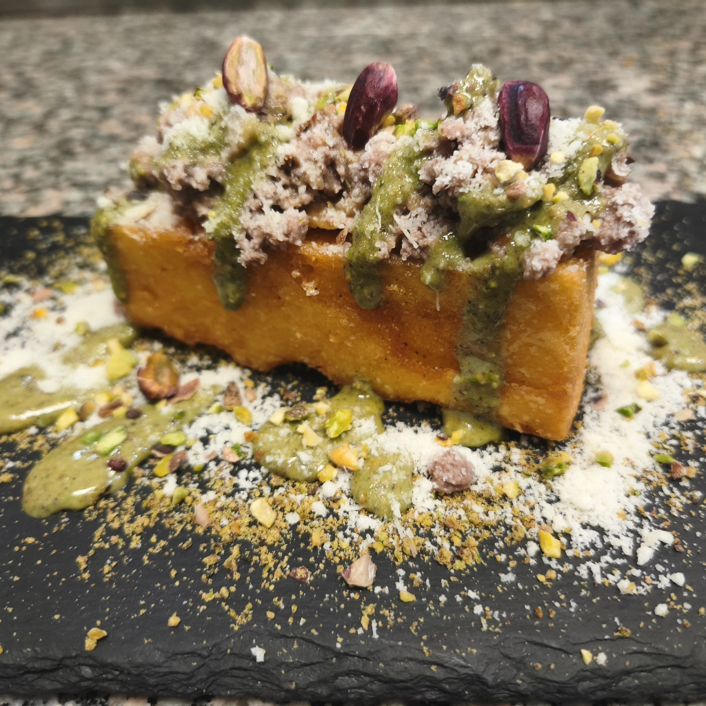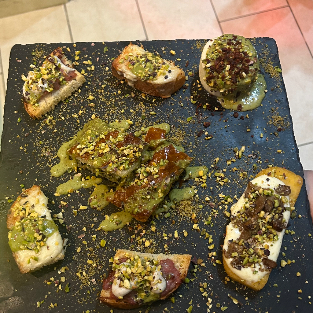 Doppia bruschetta con salsiccia, majo al tartufo e pistacchio, doppia bruschetta con fonduta cacio e pepe al tartufo ,torta rustica ripiena di cicoria e salsiccia, burratina affumicata croccante guanciale croccante e pesto di pistacchio siciliano, lingotto di polenta con fonduta cacio e pepe e pistacchio, crema cacio e pepe e pistacchio *Disponibile anche per 3 su richiesta(Allergeni: 1, 5, 7, 8)