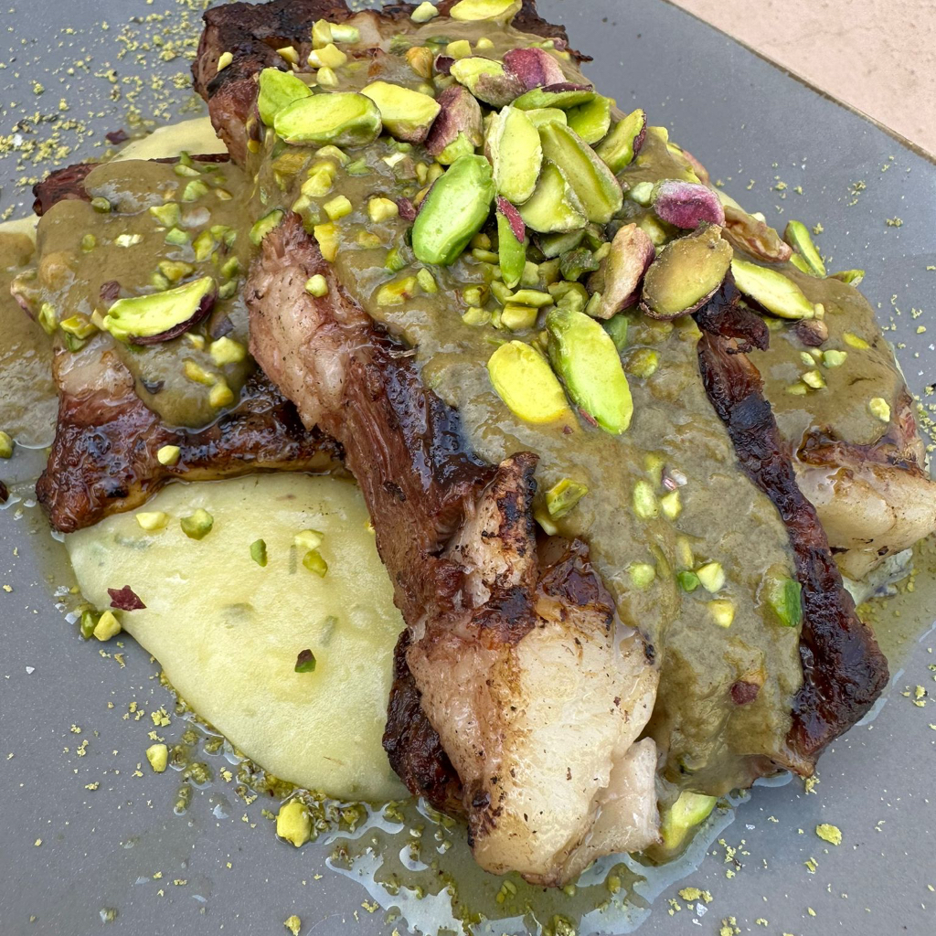Costole di manzo extra morbide CBT poi scottate alla brace, su crema di patate al tartufo, il suo fondo di cottura e pistacchio in tripla consistenza (Allergeni: 5,8,9)