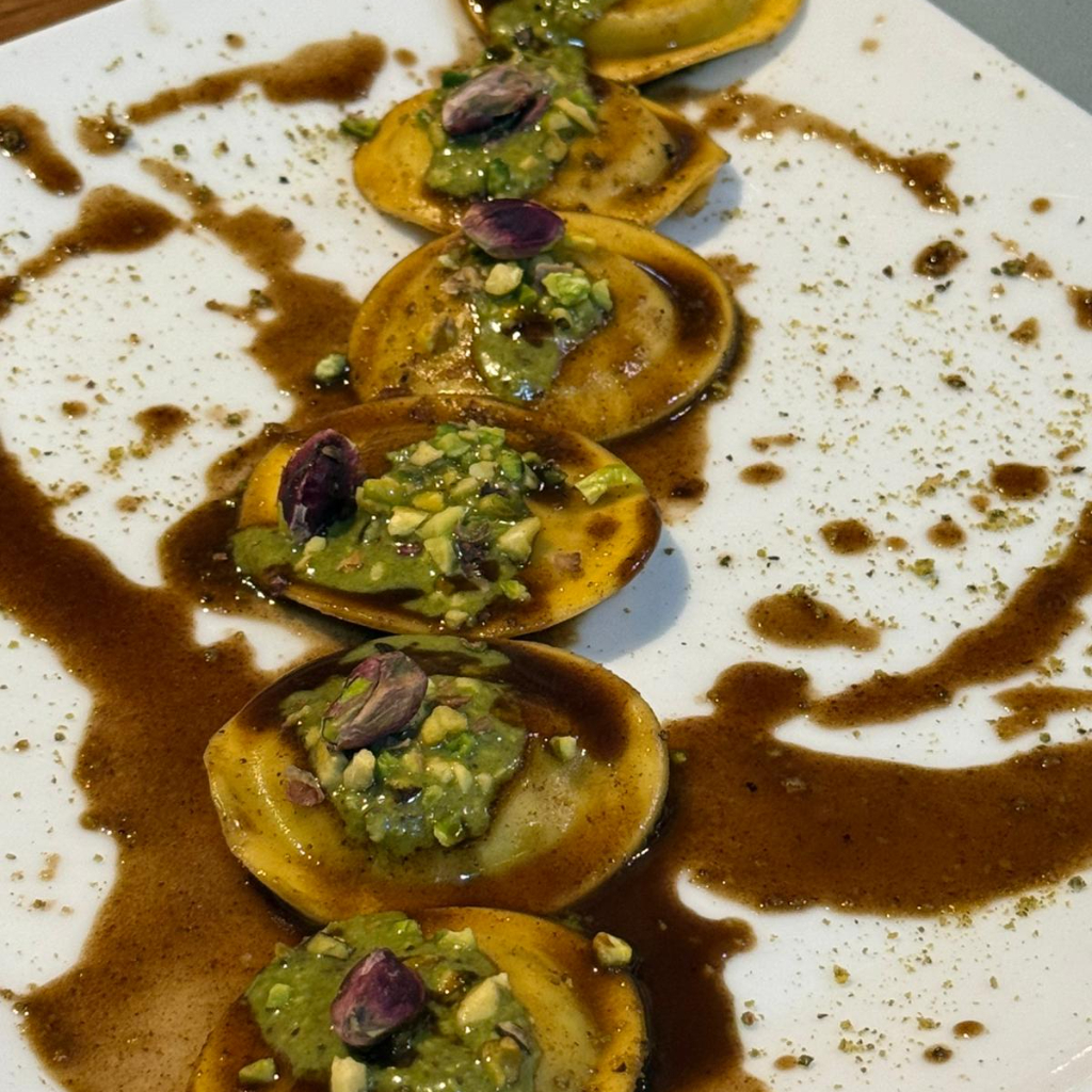 Bottoni ripieni di brasato di manzo, mantecati con il suo fondo di cottura, e Pistacchio in tripla consistenza (Allergeni: 1, 5, 7, 8)
