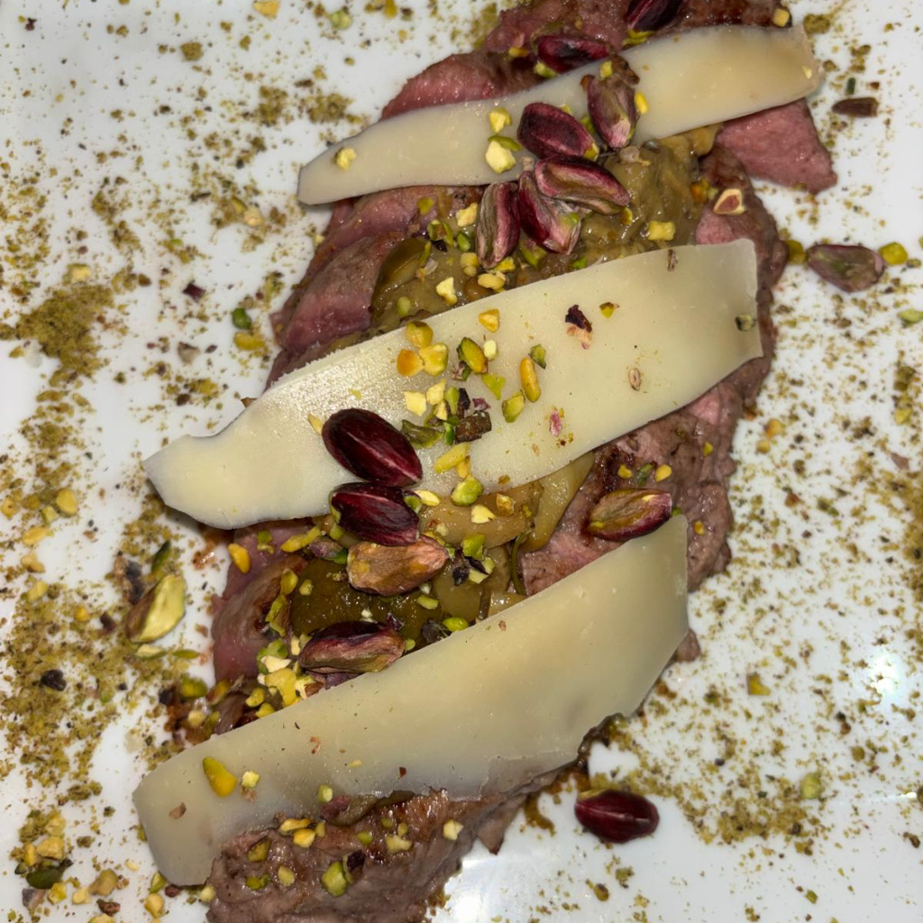 Tartare di Fassona Piemontese sul suo midollo, scaglie di Parmigiano e Pistacchio in doppia consistenza (Allergeni: 5, 7, 8)